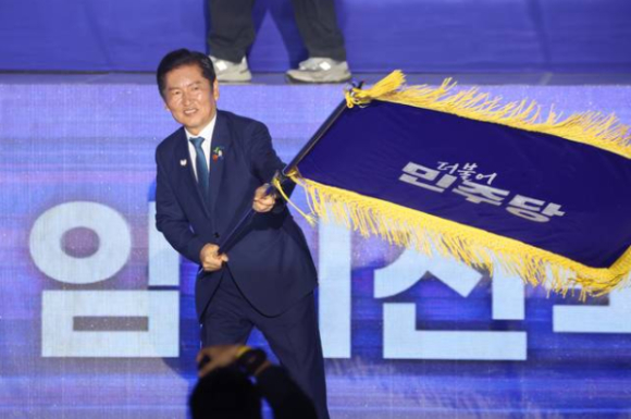 ↑↑ 더불어민주당 정청래 신임 당대표가 2일 고양 킨텍스에서 열린 전국당원대회에서 김병기 당대표 직무대행 겸 원내대표로부터 받은 당기를 흔들고 있다