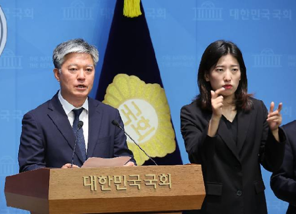 ↑↑ 30일 서울 여의도 국회 소통관에서 열린 지귀연 부장판사의 룸살롱 접대 의혹 사건 관련 기자회견에서 더불어민주당 정의찬 원내대표실 정무실장이 지귀연 판사 교체와 공수처 수사를 촉구하고 있다. (사진 = 연합뉴스)