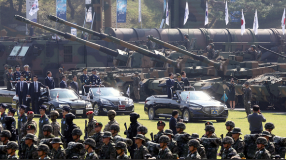 이날 행사에선 'K-방산 대표 제대'가 별도로 편성됐다. K9 자주포, K2 전차, K21 보병전투차량, 차륜형장갑차 '백호', 대전차 유도무기 '현궁', 차륜형 대공포 '천호' 등 K-방산 대표 전력들은 세계가 인정한 대한민국 방산 기술의 저력을 과시했다.