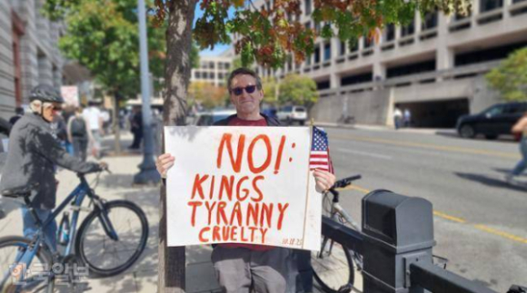 ↑↑ 18일 미국 워싱턴 ‘노 킹스(No Kings·왕은 없다)’ 시위에 참가한 밥이 본보 인터뷰 뒤 ‘왕과 독재와 잔인함에 반대한다’고 적힌 손팻말을 들고 포즈를 취하고 있다. (사진 = 워싱턴 =한국일보)