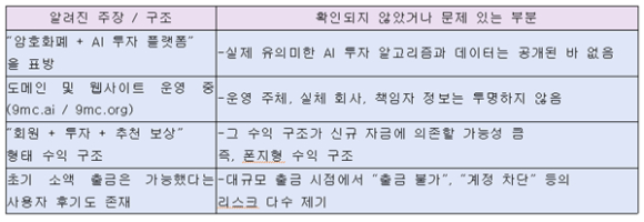 9M AI를 “정규 투자회사보다는, ‘고수익을 가장한 투자 사기 가능성이 높은 플랫폼’”으로 보는 것이 합리적이라고 생각한다.