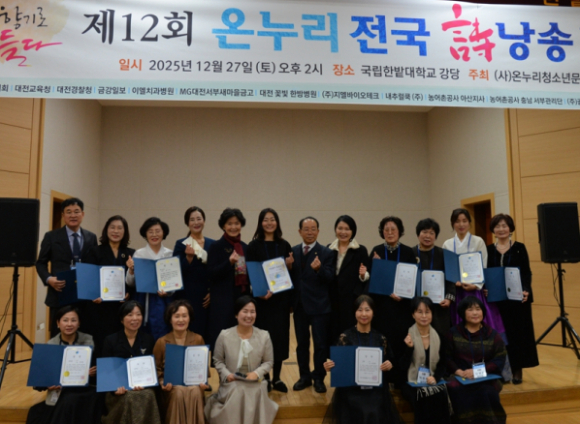 [대전, 옴부즈맨뉴스] 최계홍 취재본부장 = (사)온누리청소년문화재단과 금강일보가 주최하고 유성지회와 대전시낭송예술인 협회가 주관하는 '제12회 온누리 전국시낭송대회'가 27일 한밭대학교 평생교육원에서 성황리에 개최되었다.