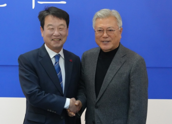 ↑↑ 김한수 전 배재대 부총장이 17일 대전 배재대학교 21세기관에서 열린 “교실을 교실답게” 출판기념회에서 문재인 전 대통령과 악수하고 있다. (사진 = OM뉴스)