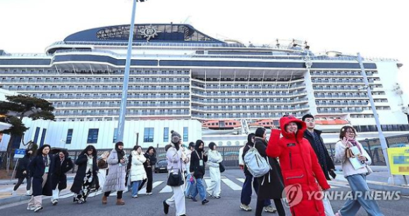 ↑↑ 중국의 '한일령'(限日令) 여파로 중국발 크루즈 인천항 입항이 급증하고 있는 가운데 6일 오전 인천 연수구 국제크루즈터미널에 입항한 MSC 벨리시마호(17만t급) 승객 중국인 관광객 3000여명이 입국하고 있다. (사진 = 연합뉴스)
